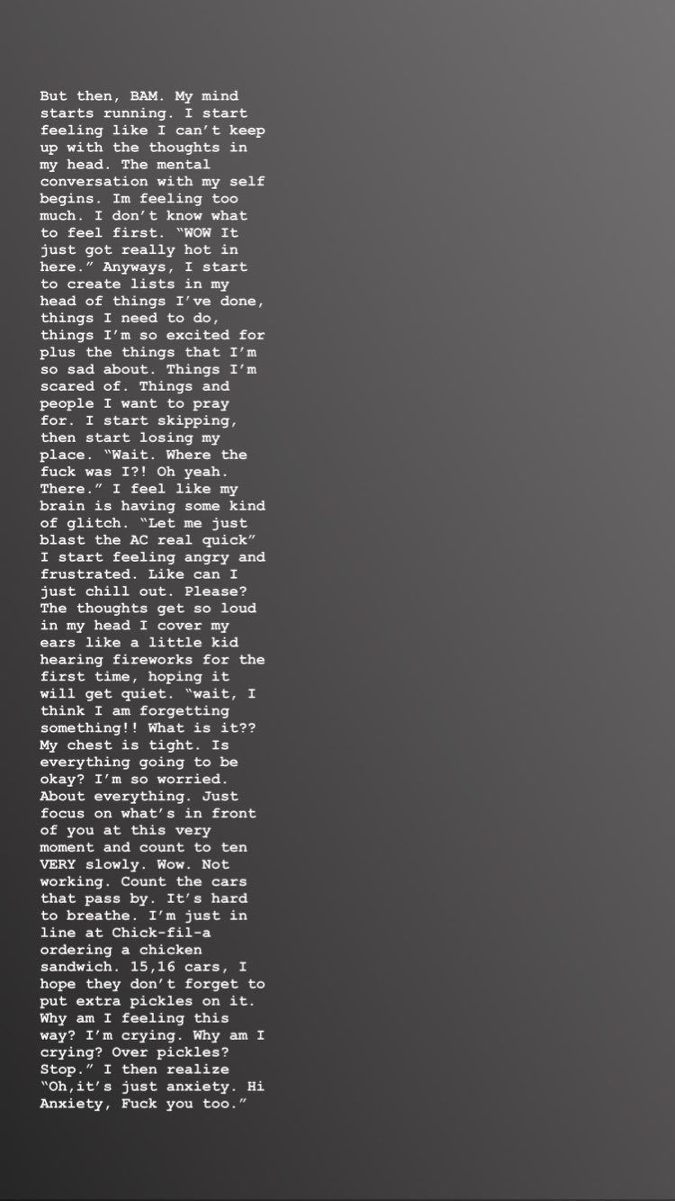 “Trato de convencerme de que todo está bien. Que puedo manejarlo. No hay problemas. Sigamos, pero de repente, BAM. Mi mente comienza a correr, y siento que no puedo mantener todos mis pensamientos en mi cabeza”, agregó.