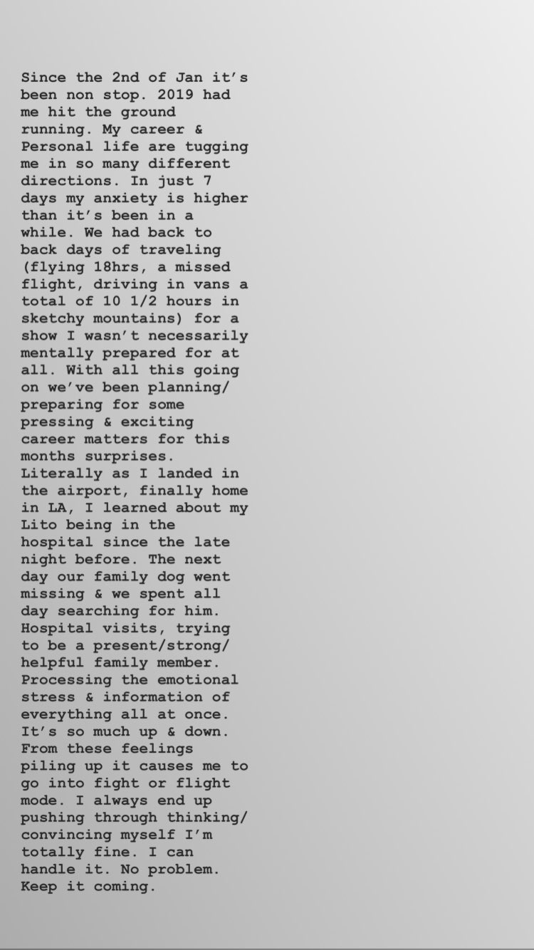 La cantante de 21 años escribió una conmovedora confesión en su cuenta de Instagram por el delicado estado de salud de un familiar y por un cuadro de ansiedad que la aqueja.