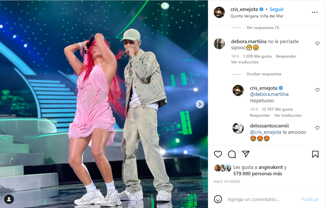 Chile aún no puede olvidar lo vivido durante la primera noche del Festival de Viña 2023, cuando Karol G invitó a Cris Mj a cantar el remix de Una Noche en Medellín al escenario. El chileno pisó por primera vez la Quinta Vergara de la mano de la Bichota para interpretar su canción más famosa, que estuvo a punto de ser una colaboración con la intérprete de Gatúbela. Arriba de la tarima, ambos cantaron sus partes de la letra y por supuesto, perrearon. Sin embargo, hubo un detalle que le llamó la atención a las personas. Es que el artista urbano se vio particularmente cohibido por la intérprete de Tusa, algo que le recalcaron sus fans en redes sociales. Sus seguidores aprovecharon la foto que el "Más que suena" compartió junto a Karol G para comentarle "no la perreaste sípo".