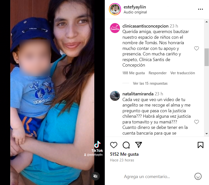 En ese sentido, un comentario resaltó entre los cientos de mensajes de apoyo: "Querida amiga, queremos bautizar nuestro espacio de niños con el nombre de Tomás. Nos honraría mucho contar con tu apoyo y presencia. Con mucha cariño y respeto, Clínica Santis de Concepción", escribió el recinto.