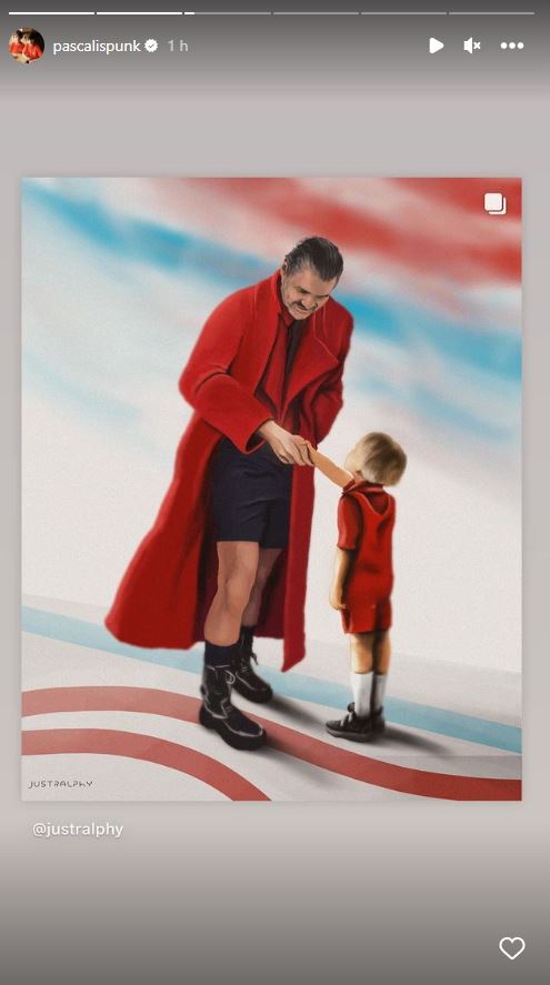 Se trató de un dibujo que realizó un usuario en Instagram y que hizo alusión a una foto que había compartido la hermana del actor tiempo atrás. En la ilustración se puede ver a Pedro Pascal tomando la mano de un pequeño niño vestido de rojo.