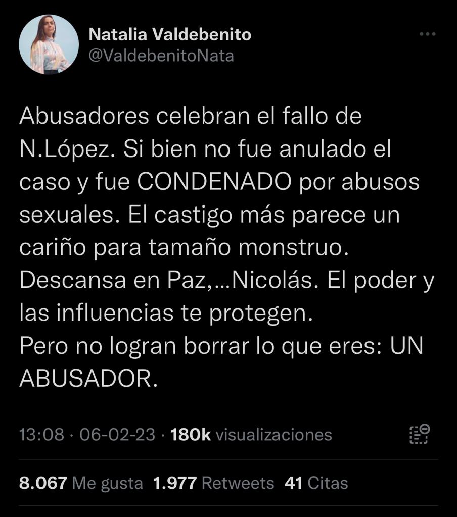 Finalmente, cabe mencionar que la comediante Natalia Valdebenito recalcó el hecho de que el cineasta haya sido condenado, pero criticó que "el castigo me parece un cariño para tamaño monstruo". "El poder y las influencias te protegen. Pero no logran borrar lo que eres: UN ABUSADOR", sentenció.🔴COMUNICADO PÚBLICO