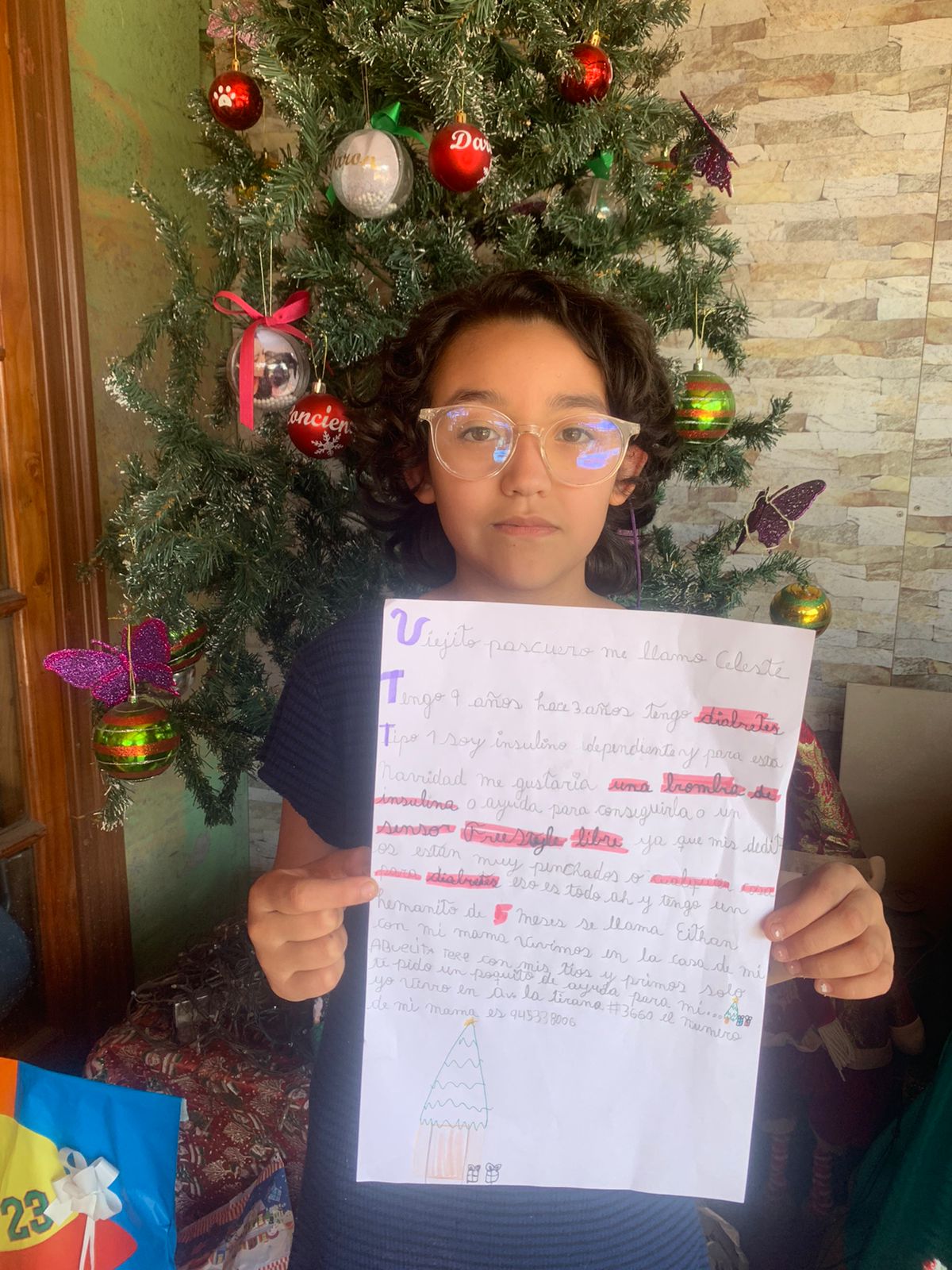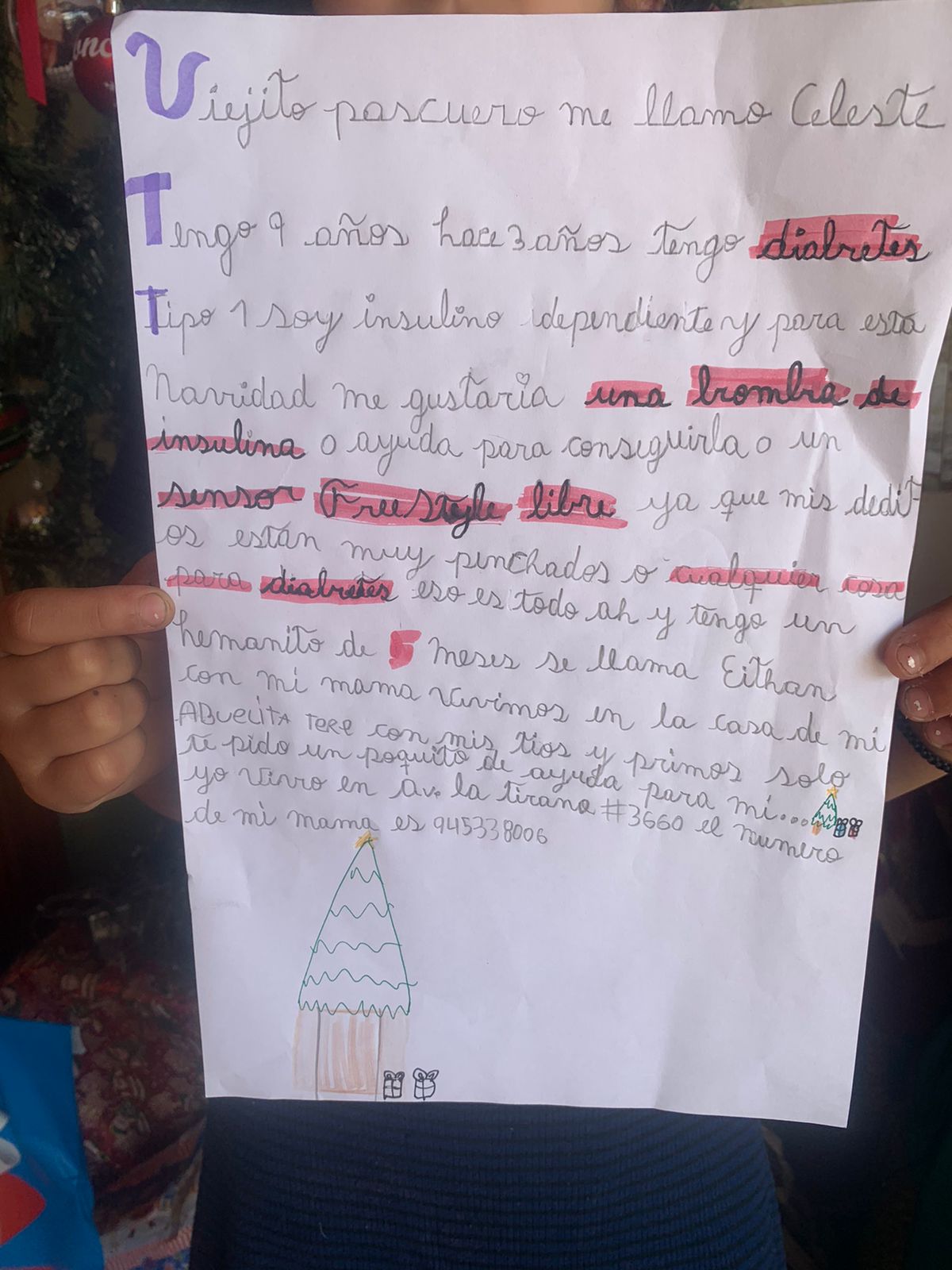 "Viejito Pascuero, me llamo Celeste. Tengo 9 años. Hace tres años tengo diabetes tipo 1, soy insulinodependiente y para esta Navidad me gustaría una bomba de insulina o ayuda para conseguirla o un sensor freestyle libre, ya que mis deditos están muy pinchados, o cualquier cosa para diabetes. Eso es todo. Ah.. y tengo un hermanito de cinco meses, se llama Eithan. Con mi mamá vivimos en la casa de mi abuelita Tere, con mis tíos y primos. Sólo te pido un poquito de ayuda para mí", dijo la niña en la carta.