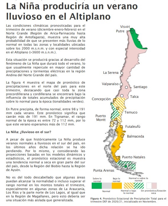 La Niña es sinónimo de menos lluvias en el centro-sur del país, pero aumenta la posibilidad de mayores precipitaciones en el altiplano con el consiguiente riesgo de aluviones, escurrimiento de agua y sedimentos por las quebradas y el aumento sorpresivo de los caudales de los ríos.
