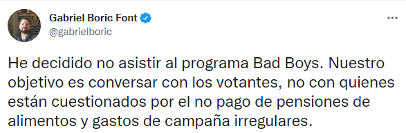 El candidato presidencial de Apruebo Dignidad, Gabriel Boric, finalmente confirmó que no participará en el programa de Franco Parisi conocido como “Bad Boys”, el cual estaba programado para este viernes en la noche.