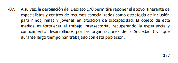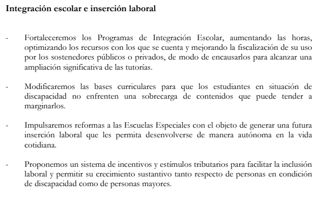 Textualmente, el programa de Kast para la primera vuelta indicaba que "la derogación del Decreto 170 permitirá reponer el apoyo itinerante de especialistas y centros de recursos especializados como estrategia de inclusión para niños, niñas y jóvenes en situación de discapacidad. El objeto de esta medida es fortalecer el trabajo intersectorial, recuperando la experiencia y conocimiento desarrollados por las organizaciones de la Sociedad Civil que durante largo tiempo han trabajado con esta población".