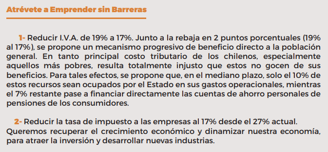 El primer programa de gobierno del candidato del Frente Social Cristiano apuntaba a dos fines económicos que generaron repercusiones en el sector. Uno de ellos, se relacionaba con "reducir I.V.A. de 19% a 17%", y junto a ello, "un mecanismo progresivo de beneficio directo a la población general".