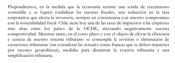 Dichas aseveraciones se ven plasmadas en su nueva propuesta, ya que aclara que de la reducción en la tasa corporativa será "en la medida que la economía retome una senda de crecimiento sostenible y se logren estabilizar las cuentas fiscales", argumentando que "Chile tiene hoy una de las tasas de impuestos a las empresas más altas entre los países de la OCDE, afectando negativamente nuestra competitividad".