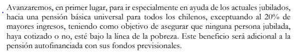 En esta materia, el nuevo programa del candidato explicita aún más la idea de la pensión básica universal, indicando que abarcaría al 80% de los chilenos de menores ingresos. Un beneficio que sería adicional a la pensión autofinanciada y cuyo objetivo es "asegurar que ninguna persona jubilada, haya cotizado o no, esté bajo la línea de la pobreza".