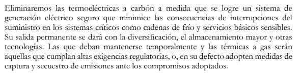 Y efectivamente esa modificación se llevó a cabo, ya que en la nueva propuesta se aborda este eje y se asegura que "eliminaremos las termoeléctricas a carbón a medida que se logre un sistema de generación eléctrico seguro que minimice las consecuencias de interrupciones del suministro en los sistemas críticos como cadenas de frío y servicios básicos sensibles".