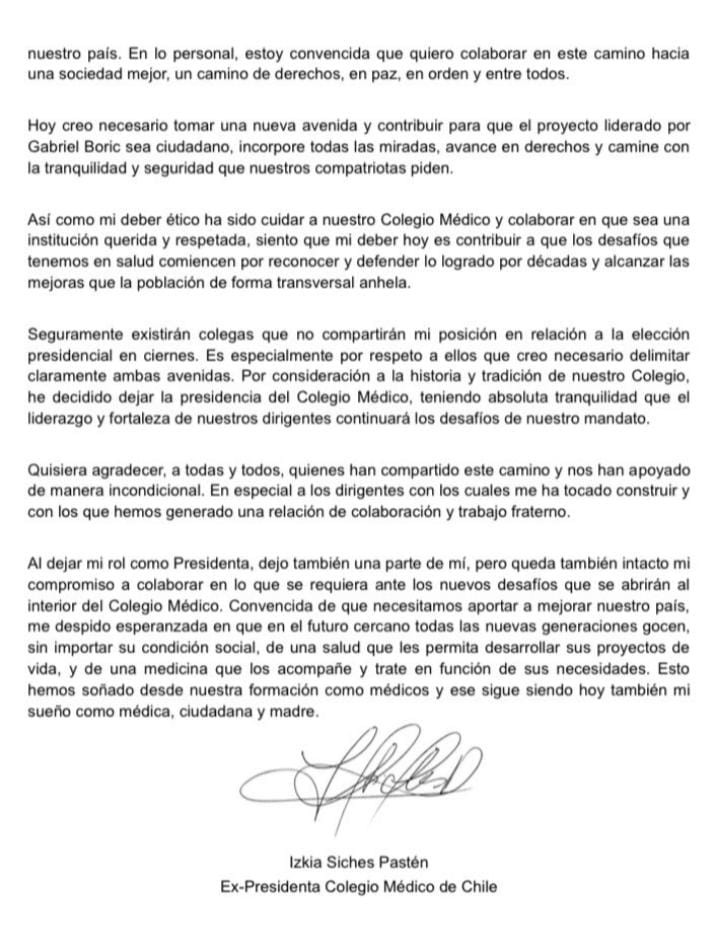 Izkia Siches anunció que dejará su cargo como presidenta del Colegio Médico (Colmed), para sumarse al equipo del candidato presidencial de Apruebo Dignidad, Gabriel Boric.