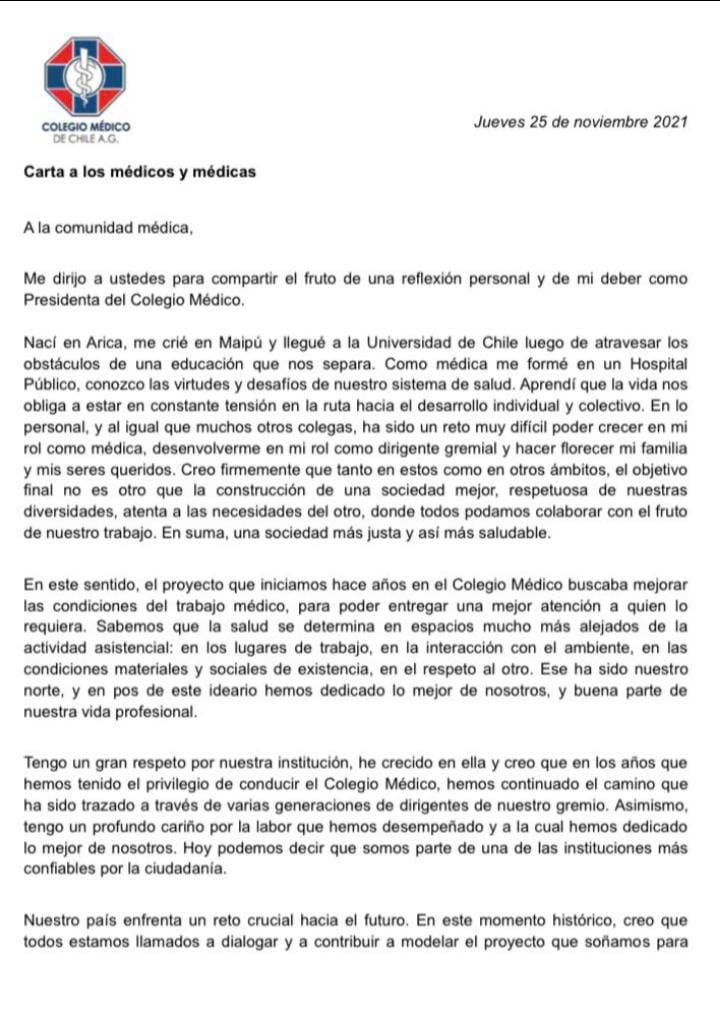 "Siento que mi deber hoy es contribuir a que los desafíos que tenemos en salud comiencen por reconocer y defender lo logrado por décadas y alcanzar las mejoras que la población de forma transversal anhela", señaló en la declaración, en la que agradeció al Colmed por los años de trabajo.
