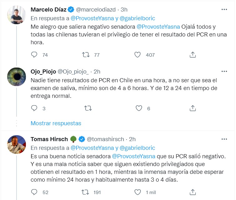Mientras el diputado Marcelo Díaz (IND) le dijo que "ojalá todos y todas las chilenas tuvieran el privilegio de tener el resultado del PCR en una hora", su par Tomás Hirsch sostuvo que "es una mala noticia saber que siguen existiendo privilegiados que obtienen el resultado en una hora, mientras la inmensa mayoría debe esperar como mínimo 24 horas y habitualmente hasta tres o cuatro días".