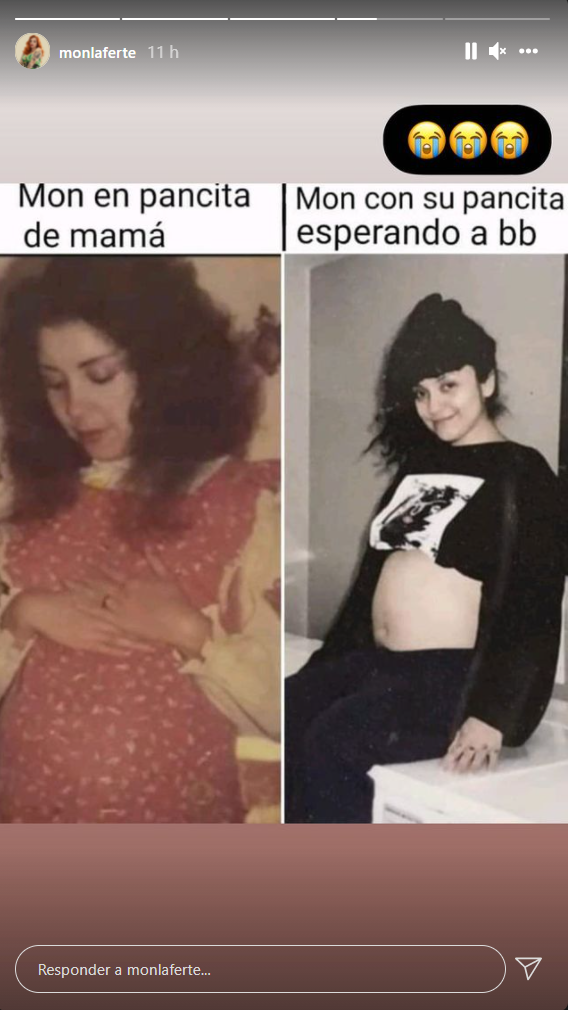 Mediante sus historias de Instagram, la cantante de Antes de ti hizo un comparativo entre las imágenes. "Mon con su pancita esperando a su bebé", escribió junto a una de las postales.