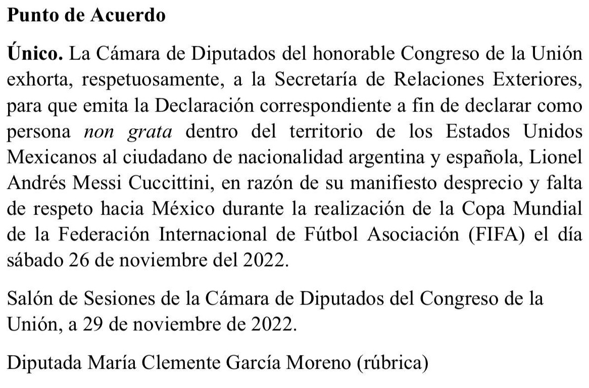 Una diputada Mexicana presentó un proyecto para declarar a Messi persona no grata pic.twitter.com/yXKS4buoYl— Rama🎧🎸 (@RamaCarpani) December 7, 2022
