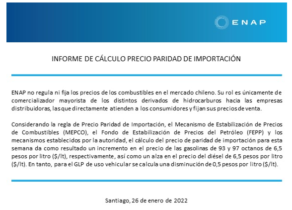 Durante la jornada de este miércoles 26 de enero, la Empresa Nacional del Petróleo (ENAP) comunicó que nuevamente el precio de los combustibles sufrirá un incremento a contar de este jueves.