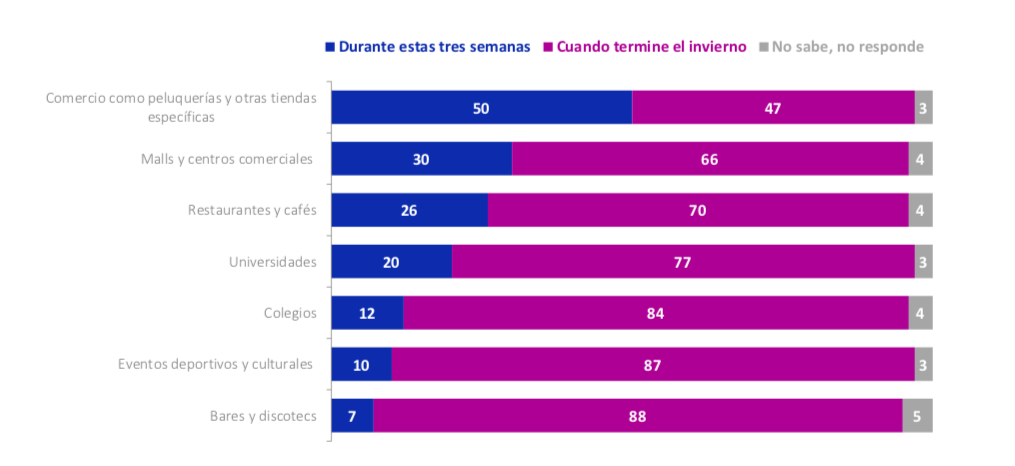 Para la reapertura de restaurantes y cafés (70%), universidades (77%) y colegios (84%), la mayoría también prefiere esperar hasta el fin del invierno.