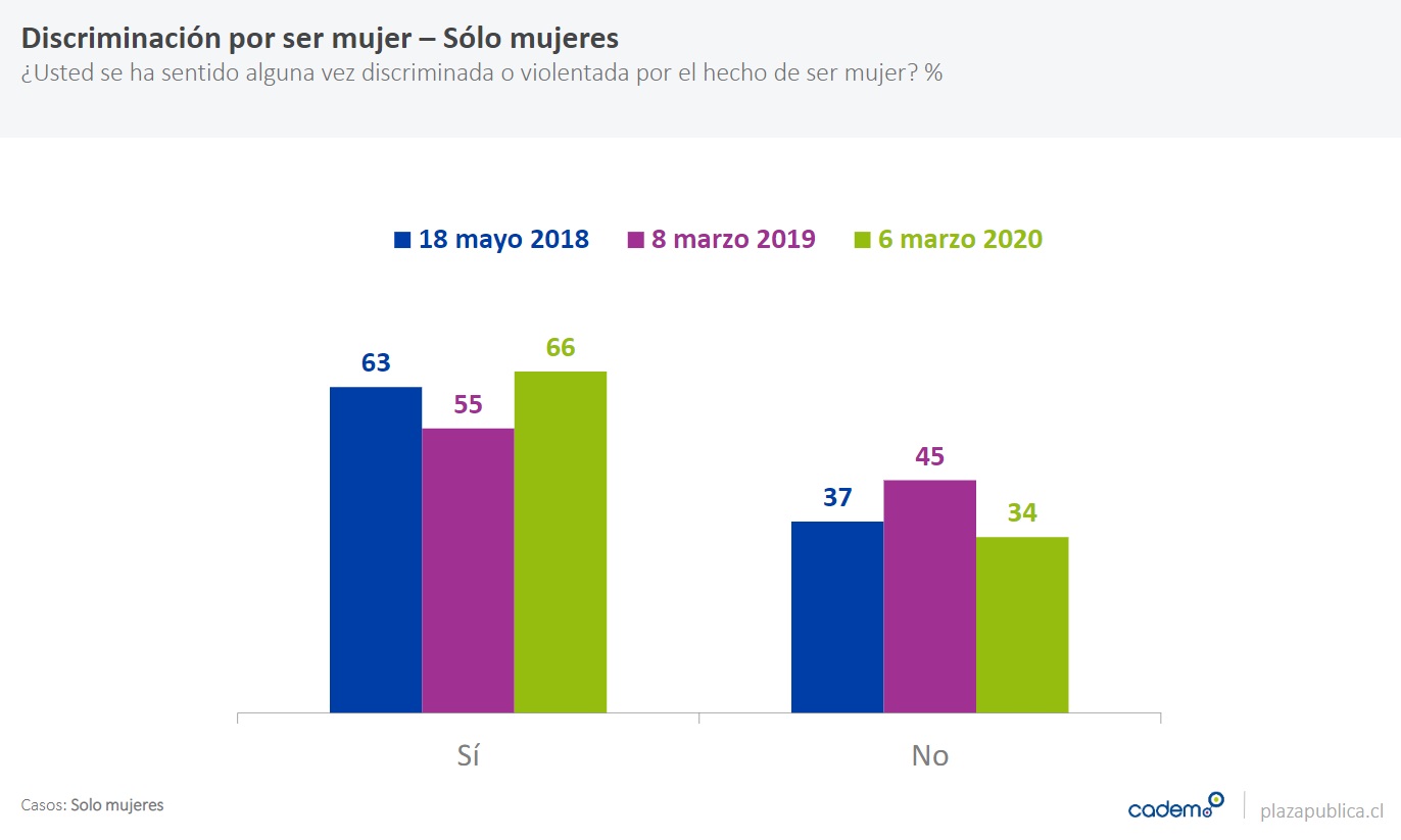 Además, el informe indica que el 66% de las mujeres aseguró que se ha sentido discriminada o violentada alguna vez solo por el hecho de ser mujer.