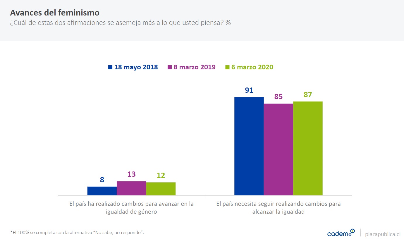 Lee también: The Guardian destacó las manifestaciones por el Día de la Mujer en ChileSobre los avances del feminismo, el 12% estima que el país ha realizado cambios para avanzar en la igualdad de género y el 87% cree que Chile necesita seguir haciendo cambios para lograr la igualdad.