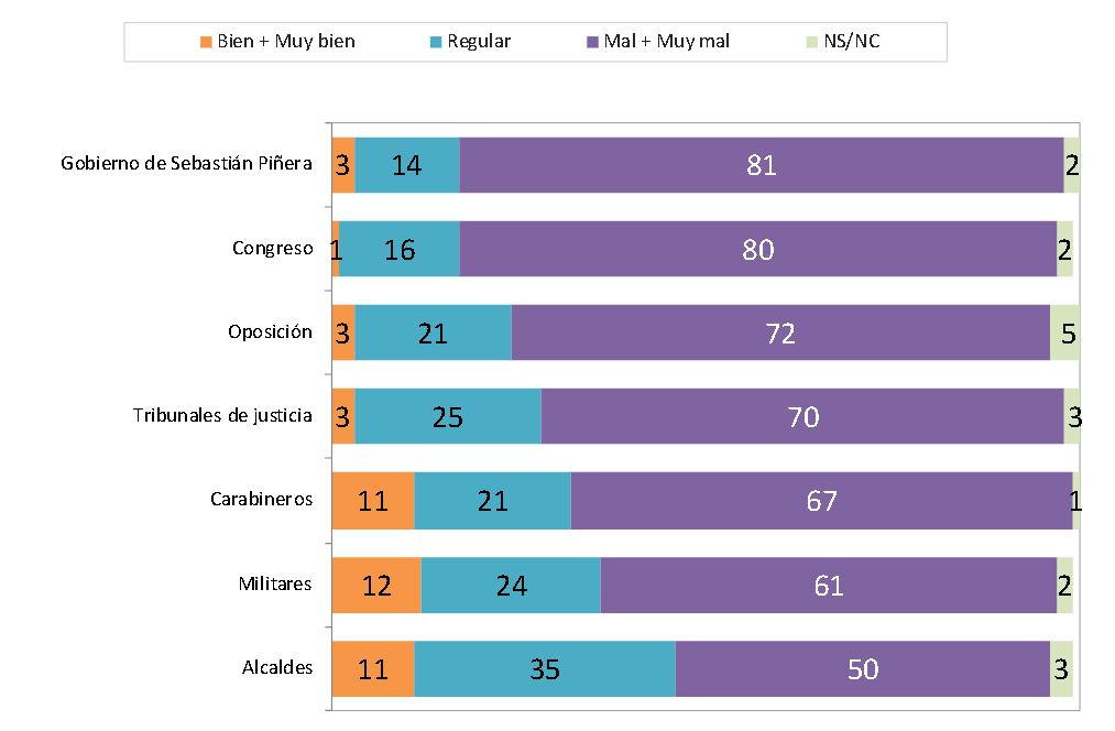 Ante la pregunta "¿Cómo evaluaría Ud. la forma en que actuaron las siguientes personas o instituciones en respuesta a la crisis que comenzó en octubre 2019?", el Congreso Nacional lidera la peor aprobación con un 1%, seguido por el Gobierno, la oposición y Tribunales de justicia, con un 3%.