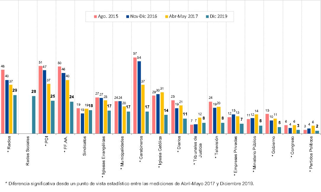 Respecto a la pregunta "a continuación le voy a leer los nombres de algunas instituciones. De acuerdo con las alternativas de la tarjeta, ¿Cuánta confianza tiene Ud. en cada una de ellas?" los resultados arrojaron una baja en la confianza de Carabineros, el Gobierno,las radios, la televisión, el Ministerio Público, entre otros detallados en el gráfico.