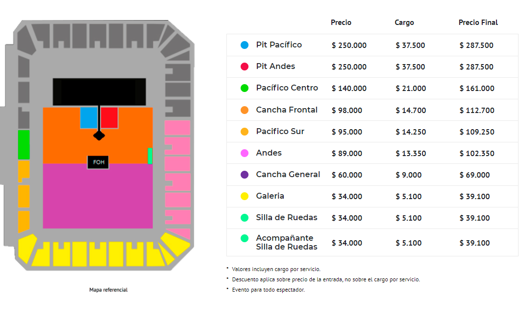 Lee también: “Creo en este proceso transformador”: Carolina Arregui confirma su voto por Boric tras aparecer en la franjaSegún lo detallado por Punto Ticket en su sitio web, el valor de las entradas será muy variado, llegando a un máximo de $287.500 (cargo incluido) en el caso de la ubicación Pit Pacífico. Mientras que la más económica corresponde a Galería, con un monto de $39.100 (cargo incluido).