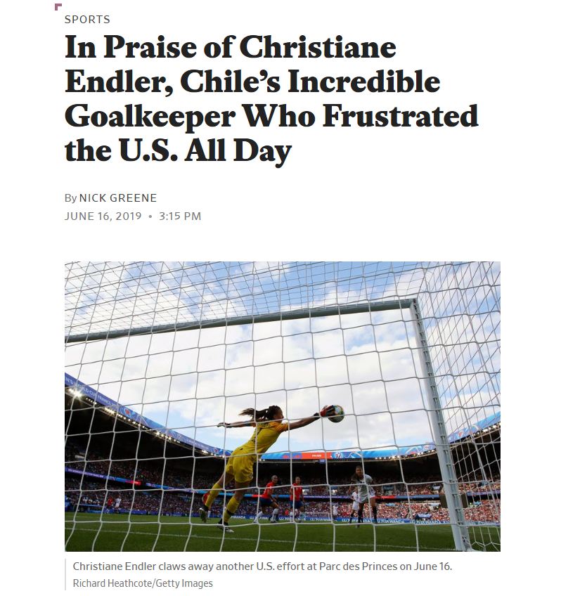 "En alabanza a Christiane Endler, la increíble arquera de Chile que frustró a Estados Unidos todo el día", fue el titular que Slate dio a su nota sobre la capitana chilena.