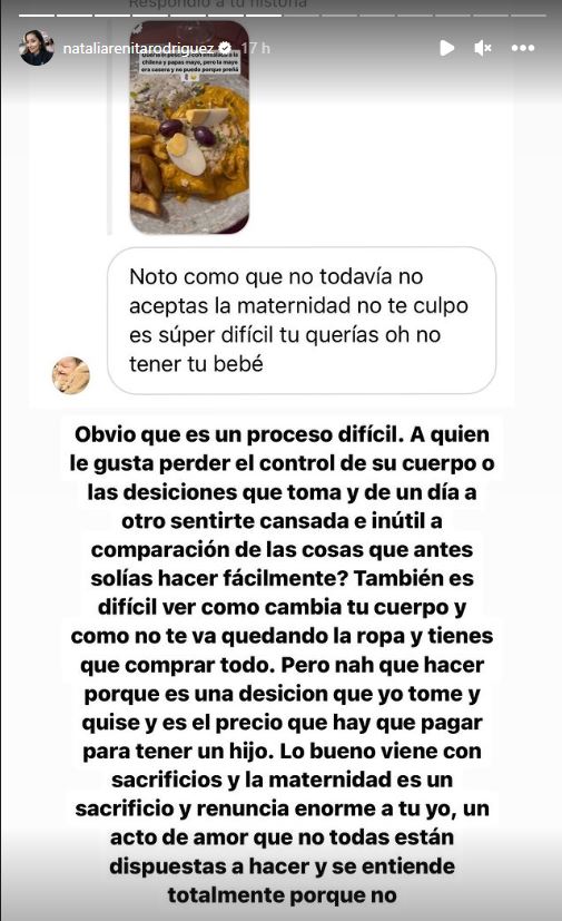 "Lo bueno viene con sacrificios y la maternidad es un sacrificio, y renuncia enorme a tu yo, un acto de amor que no todas están dispuestas a hacer y se entiende totalmente por qué no", cerró.