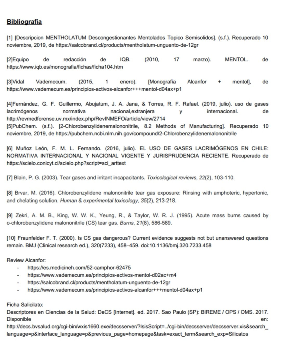 Lee también: Estudiante de la UC fue herido en la cabeza por proyectil durante enfrentamientos con CarabinerosSin embargo, en el texto se descarta que dicho compuesto tenga dichas propiedades dado que “el uso de Mentholatum ® de forma tópica en la nariz o zonas cercanas, y/o la inhalación del mismo, produciría una descongestión de las vías respiratorias, facilitando por tanto la inhalación del gas lacrimógeno”.