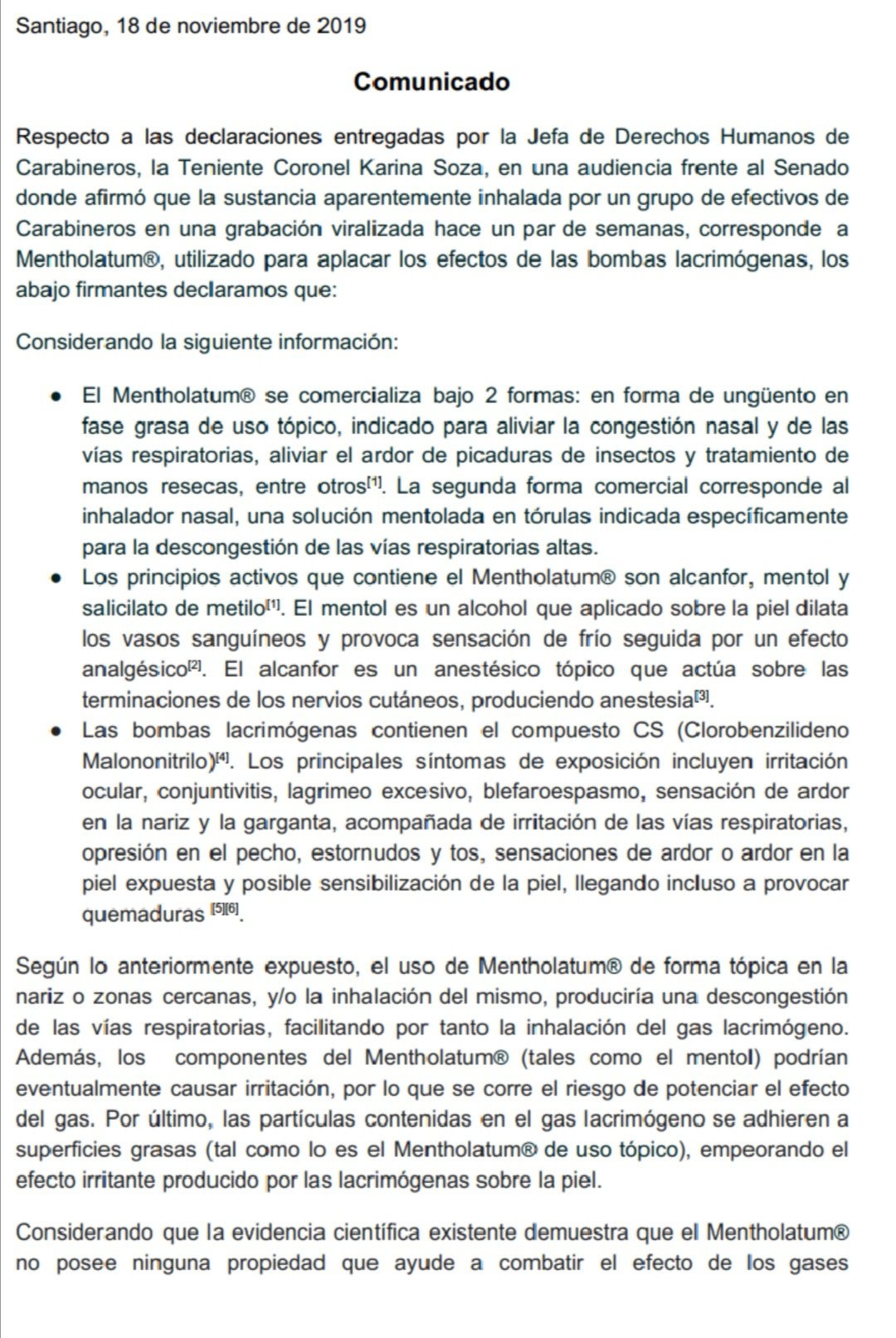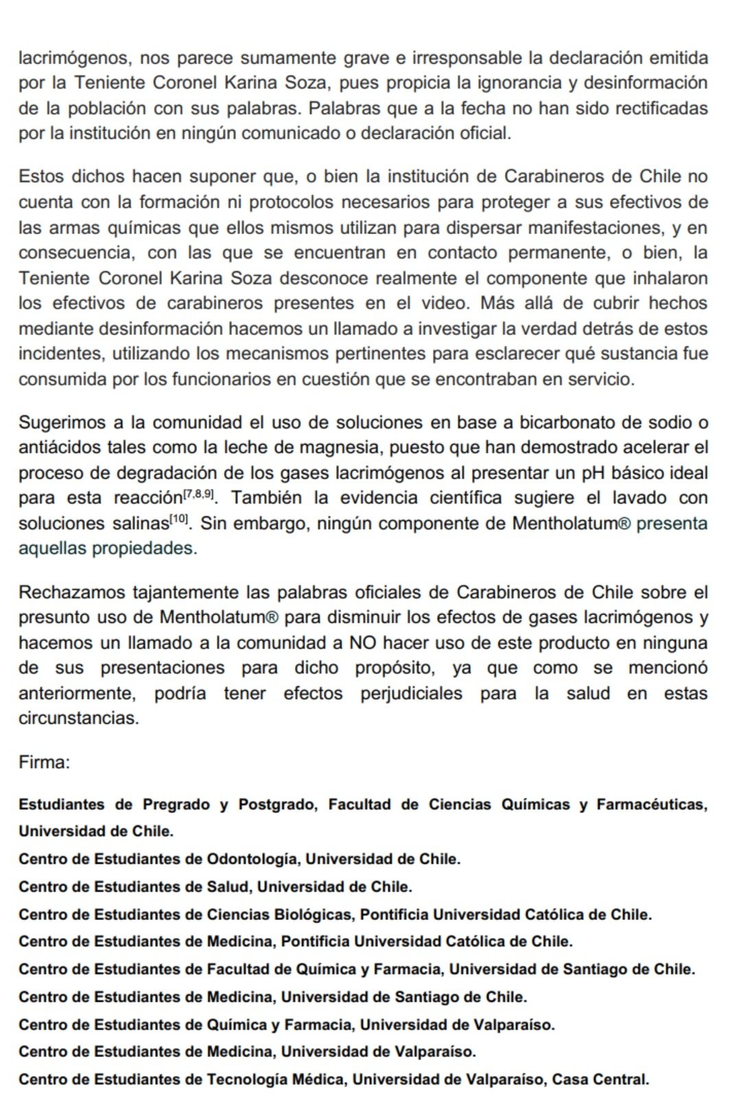 "Considerando que la evidencia científica existente demuestra que el Mentholatum ® no posee ninguna propiedad que ayude a combatir el efecto de los gases lacrimógenos, nos parece sumamente grave e irresponsable la declaración emitida por la Teniente Coronel Karina Soza, pues propicia la ignorancia y desinformación de la población con sus palabras. Palabras que a la fecha no han sido rectificadas por la institución en ningún comunicado o declaración oficial”, aseveran los firmantes.