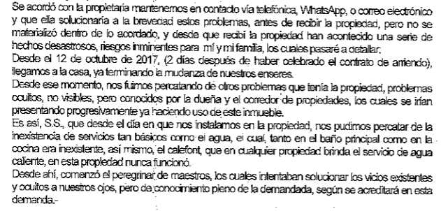 Cazares señaló que pese a estos incumplimientos, mensualmente depositó el pago del arriendo a través de transferencias electrónicas y que la única vez que demoró más de lo debido el pago fue en diciembre del año pasado como una forma de presionar para que se realizaran reparaciones.