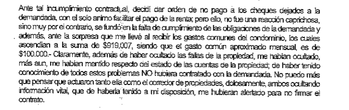 Además, en la demanda se expone que la pareja en sus primeros días en el inmueble a se encontró con una deuda de gastos comunes de más de $900 mil, siendo que el gasto común en el condominio es de $100 mil mensual.