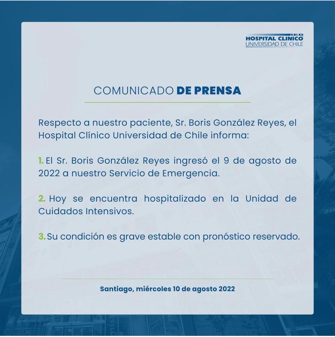 Desde el Hospital Clínico de la Universidad de Chile dieron a conocer el estado de salud del artista nacional Zalo Reyes, quien fue internado de urgencia este martes en la Unidad de Cuidados Intensivos (UCI) del recinto. A través de un comunicado de prensa, desde el centro médico indicaron que la condición médica del cantante es "grave estable con pronóstico reservado". El hijo del denominado "Gorrión de Conchalí" dijo a CHV Noticias que el intérprete de 69 años sufrió una nueva descompensación "bastante severa" producto de la diabetes que padece.
