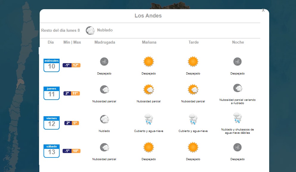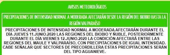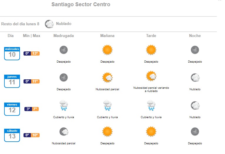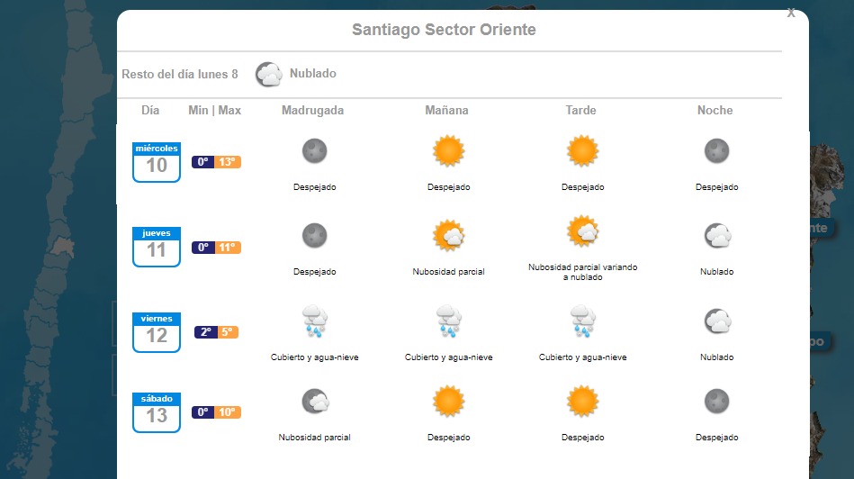 El organismo anticipa aguanieve en zonas precordilleranas de la Región Metropolitana. La llegada de un sistema frontal con aire subpolar dejaría precipitaciones con bajísimas temperaturas. Además, soplarían vientos de hasta 80 kilómetros por hora en Biobío.