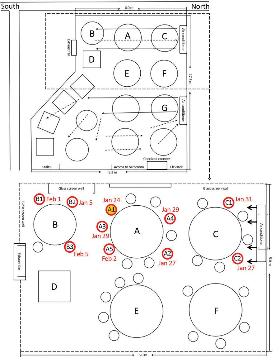 Los hechos ocurrieron a fines de enero en la ciudad china de Guangzhou, donde diez clientes, que se encontraban consumiendo alimentos en mesas vecinas dentro del mismo restaurante, dieron positivo al virus. El siguiente gráfico explica la posición de cada uno y cómo habría sido el contagio.