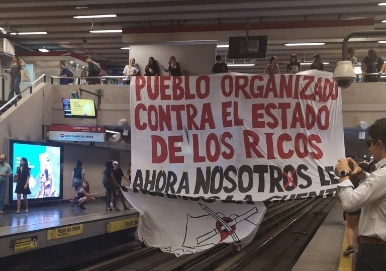 Los secundarios desplegaron al interior del recinto un lienzo con la consigna “Pueblo organizado contra el Estado de los ricos, ahora a nosotros les pasamos la cuenta”.