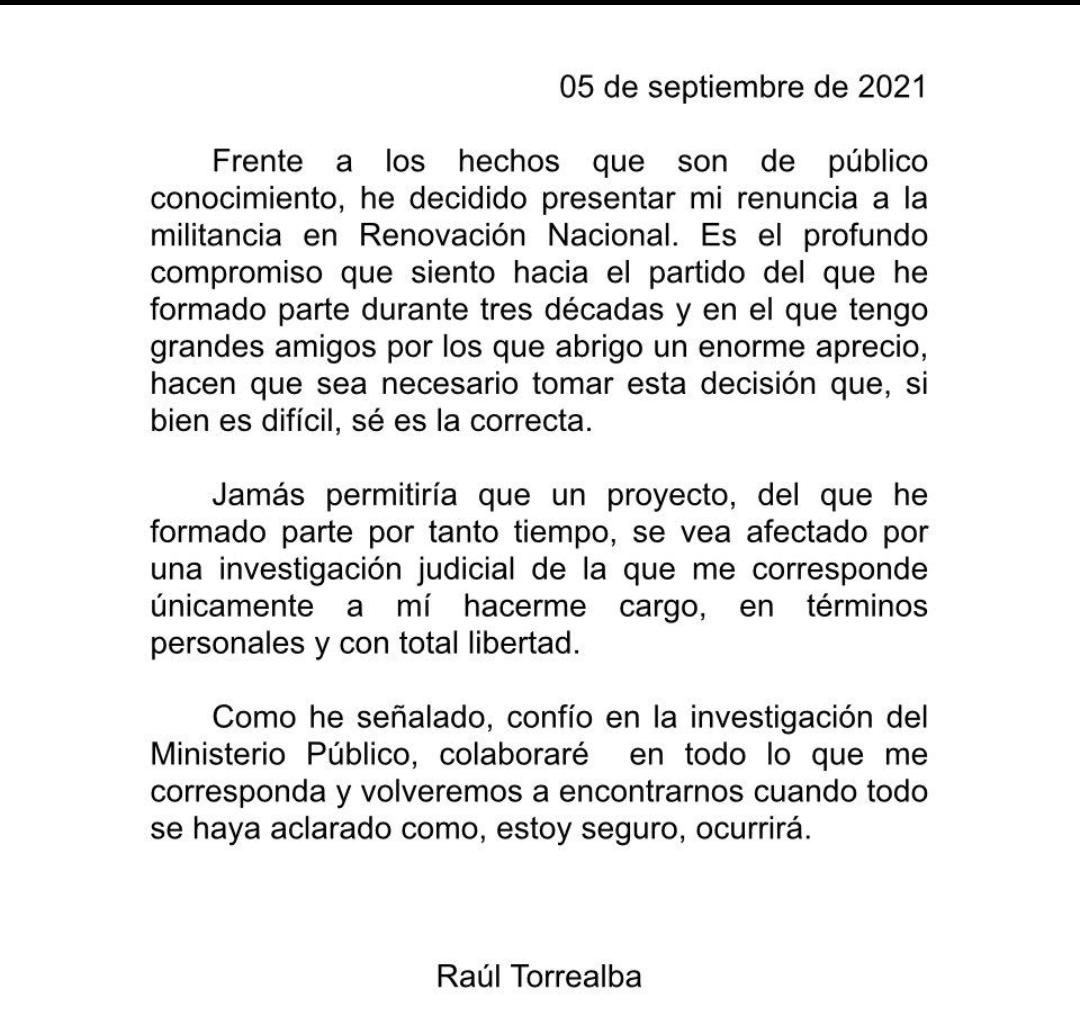 Tras ello y mediante un comunicado, Torrealba aseveró que "frente a los hechos que son de público conocimiento, he decidido presentar mi renuncia a la militancia de Renovación Nacional. Es el profundo compromiso que siento hacia el partido del que he formado parte durante tres décadas y en el que tengo grandes amigos por los que abrigo un enorme aprecio"