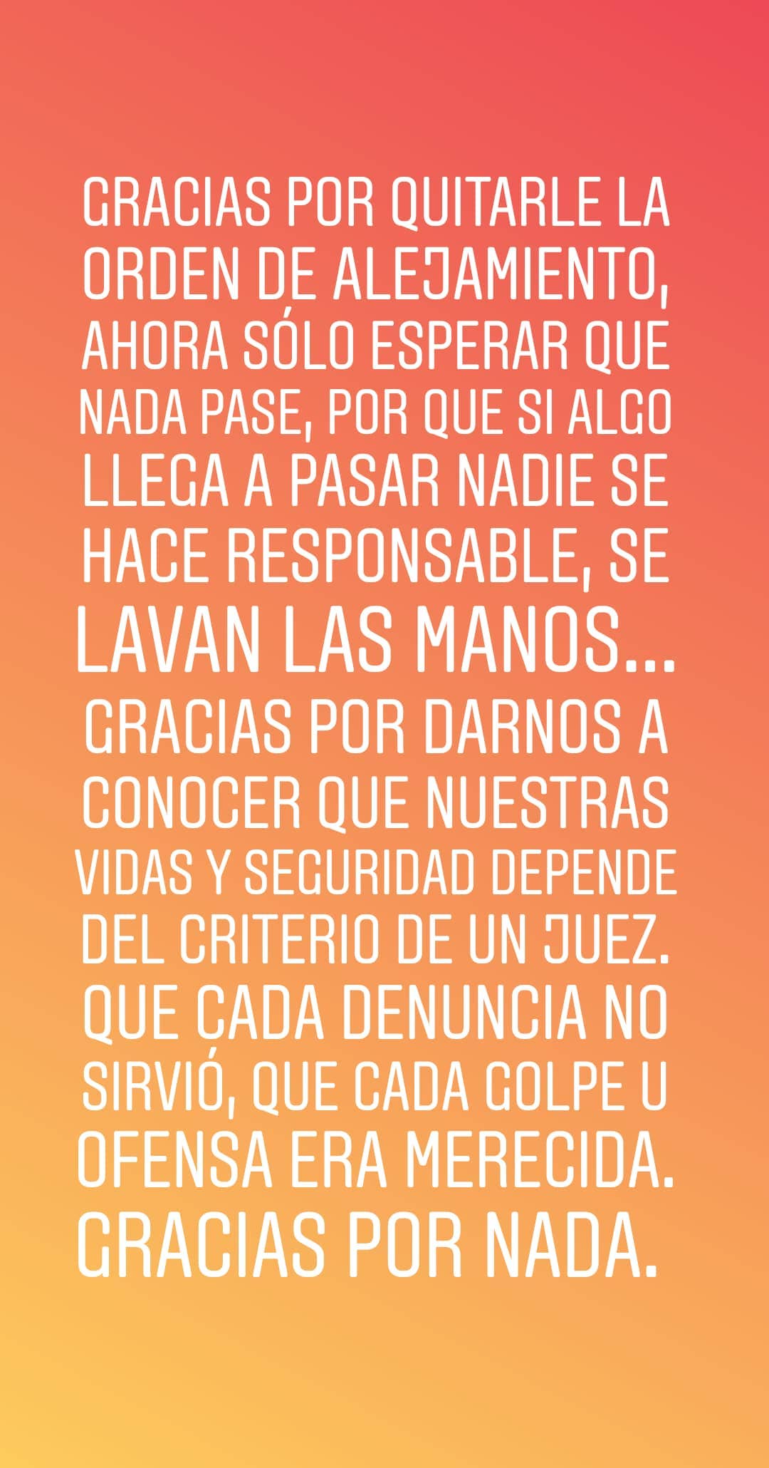 “Gracias por quitarle la orden de alejamiento, ahora solo queda esperar que nada pase, porque si algo llega a pasar, nadie se hace responsable, se lavan las manos”, escribió Angie en su Instagram tras conocer la resolución.