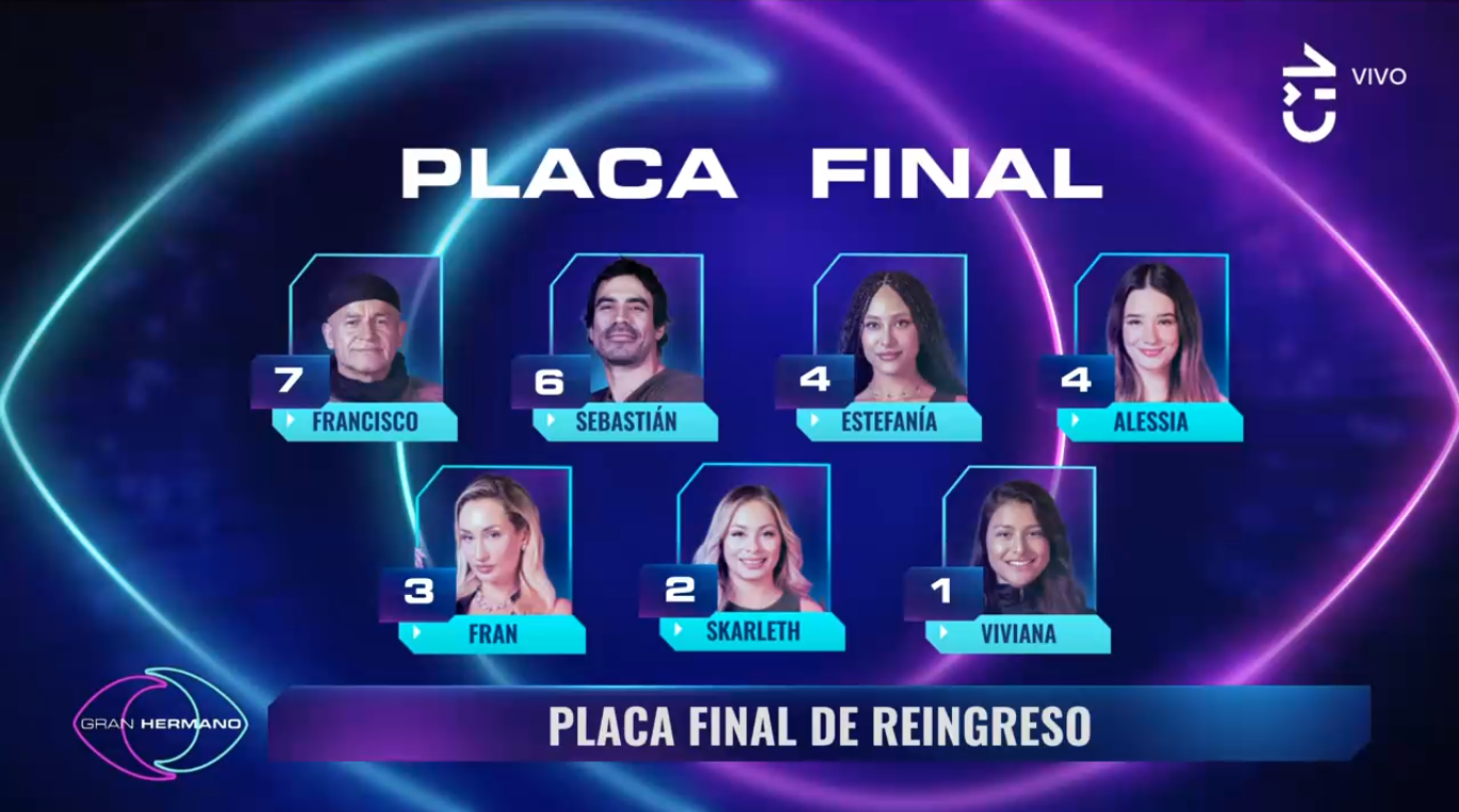 Sus votos restantes, en tanto, fueron para Alessia. "Fui yo la que votó para sacarla y siento que ella igual merece estar aquí", aseguró, causando la alegría de la cantante que se encontraba en el estudio. Cabe recordar que a los 5 jugadores confirmados para el repechaje en Gran Hermano, se sumará 1 más que será elegido por el público. Así, votando al 3331 vía mensaje de texto podrán decidir al último concursante en reingresar al encierro.