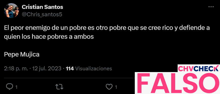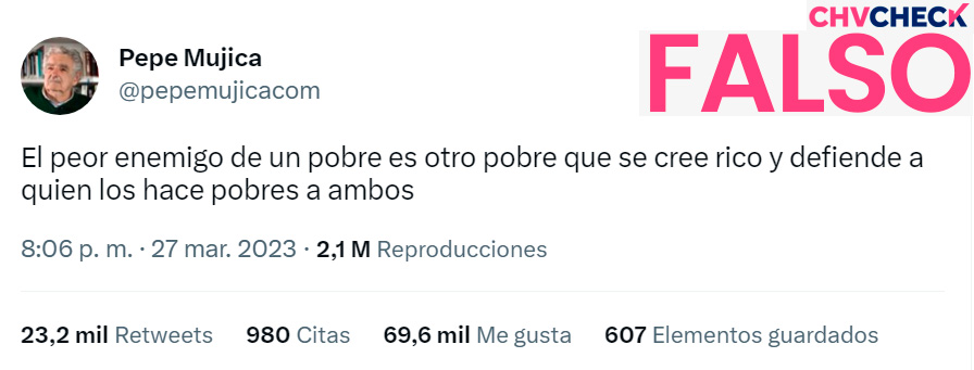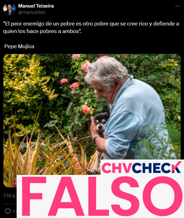 En los últimos días, se ha viralizado nuevamente una supuesta cita de José "Pepe" Mujica, acompañada de una fotografía de él y difundida en publicaciones de X. Tras un proceso de verificación, se determinó que el contenido no es auténtico.