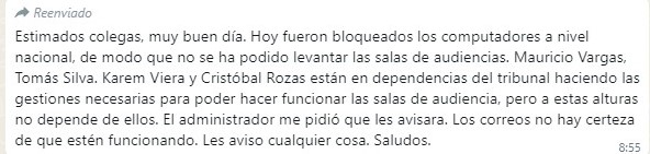 A última del domingo 25 de septiembre, algunos jueces de garantía de Santiago y regiones recibieron un mensaje de whatsapp, informando que el sistema podría estar afectado con un virus. Acto seguido corrió la voz. Varios magistrados descreyeron la versión: la única posible era otro ataque hacker.