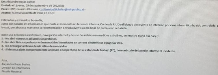 De acuerdo a varios mails enviados a los funcionarios de la fiscalía, los hechos duraron al menos hasta el viernes 30. Una nueva comunicación del departamento informático de la entidad perseguidora penal, revela una queja: el Poder Judicial no entregaba información sobre la solución del ciberproblema. Nuevamente abrir cualquier mail, quedó estrictamente prohibido hasta nuevo aviso.