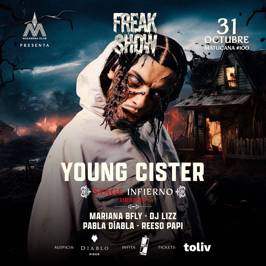 Young Cister liderará el Freak Show en el centro de eventos Matucana 100, junto a Mariana Bfly, DJ Lizz, Pabla Diabla y Resso Papi. Con escenarios de música urbana y electrónica, este evento lleno de performances te dejará sin aliento. La entrada está abierta solo para mayores de 23 años.