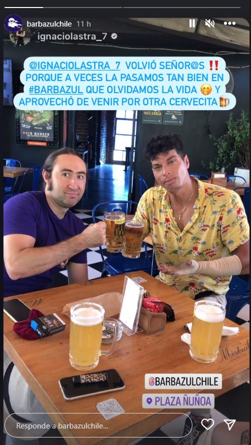 También a través de su cuenta de Instagram, Ignacio Lastra replicó la storie de Barbazul en que aparece junto a Mario Ortega bebiendo una cerveza luego del incidente que se viralizó.
