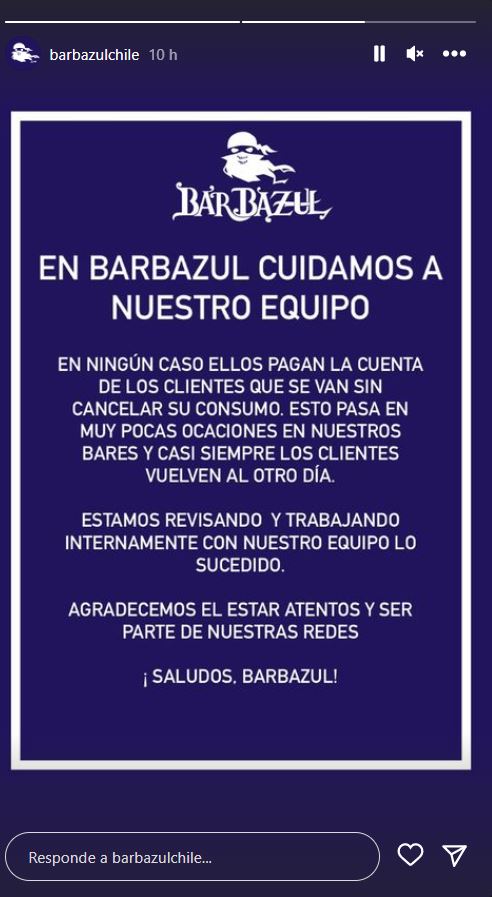 Tras esa storie, Barbazul publicó otra imagen donde respondieron a las fuertes críticas que recibieron por parte de internautas que cuestionaron el hecho de que los garzones sean quienes tengan que saldar la cuenta si es que un cliente se va sin pagar.