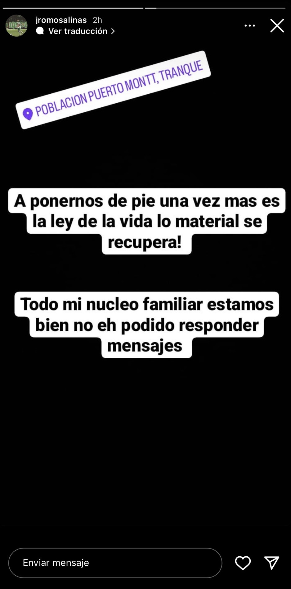 "A ponernos de pie una vez más, es la ley de la vida. Lo material se recupera. Todo mi núcleo familiar está bien. No he podido responder mensajes", comentó Romo en una de sus historias.
