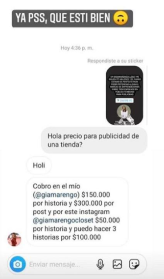 Ante esto, una usuaria dejó en evidencia que la modelo cobra desde $50 mil hasta $300 mil por posteo en Instagram. Precio que a muchos usuarios les resultó excesivo.