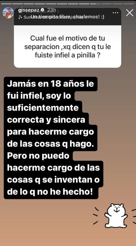 "¿Cuál fue el motivo de tu separación? ¿Por qué dicen que tu le fuiste infiel a Pinilla?", fue la interrogante que un usuario le hizo, a lo que la influencer respondió: "Jamás en 18 años le fui infiel. Soy lo suficientemente correcta y sincera para hacerme cargo de las cosas que hago".