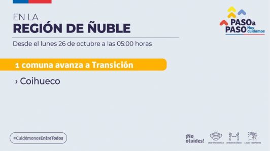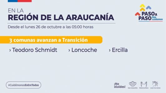 Lee también: Estudio: 65% de los chilenos no quiere volver a clases presenciales este añoEn tanto, de Cuarentena a Transición pasarán Vallenar (región de Atacama), Coihueco (región de Ñuble), Teodoro Schmidt, Loncoche y Ercilla (región de La Araucanía).