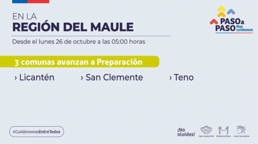 En tanto, pasarán desde la fase de Transición a Preparación Peñaflor, Cerro Navia, Macul, La Florida, Pudahuel (Región Metropolitana), Licantén, San Clemente, Teno (región del Maule), La Cruz y La Calera (región de Valparaíso).